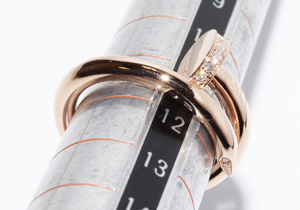 こちらは特殊なリングデザインのため、スタッフの着用感に近いサイズを記載しております。約12.5号〜13号に近い印象です。