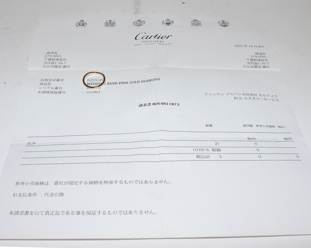 ・サイズ直し後の指輪および未使用品時計のコマ抜きをしたもの、その他お客様のご希望により加工等施したもの。