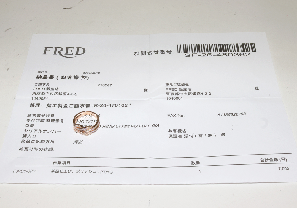 ・サイズ直し後の指輪および未使用品時計のコマ抜きをしたもの、その他お客様のご希望により加工等施したもの。